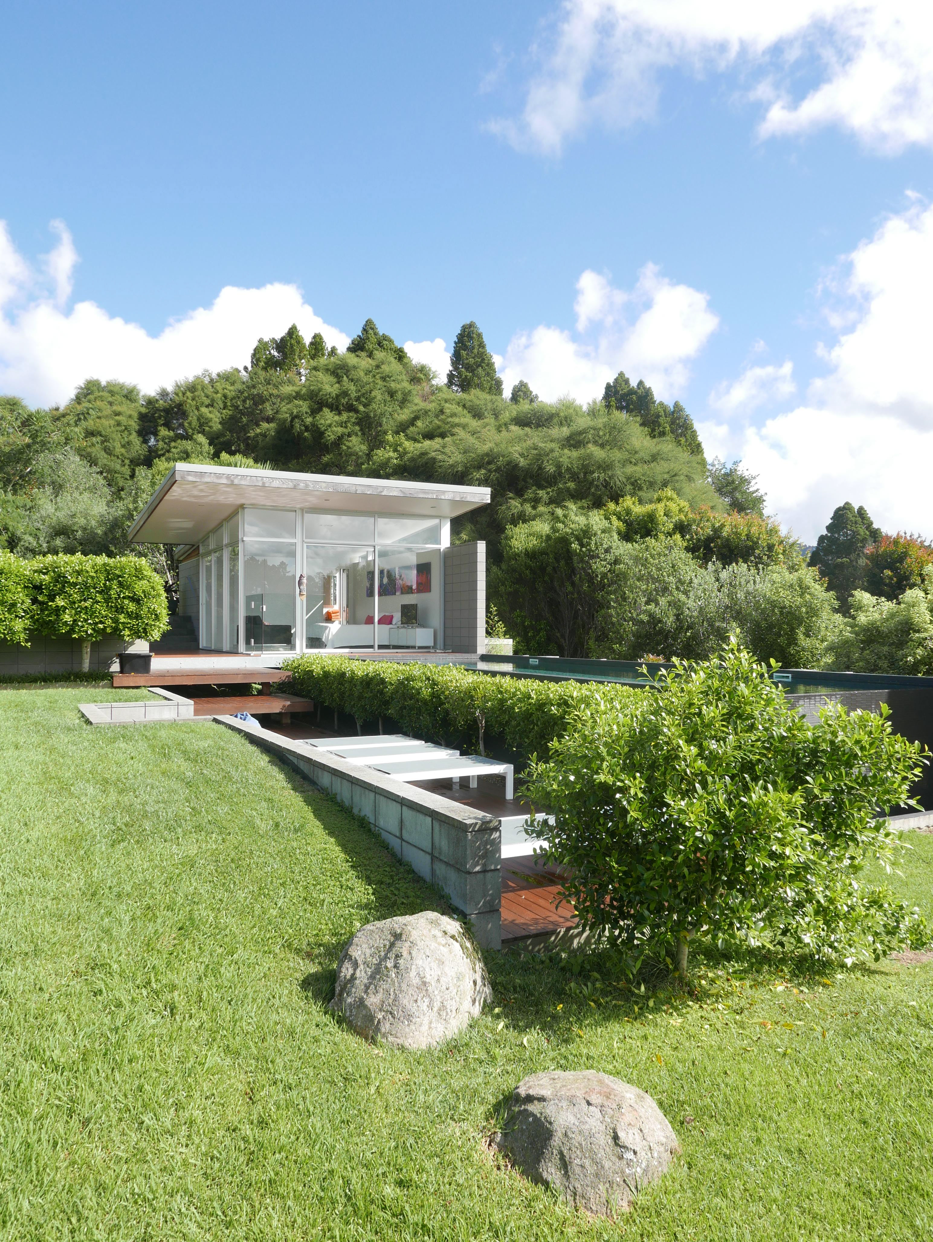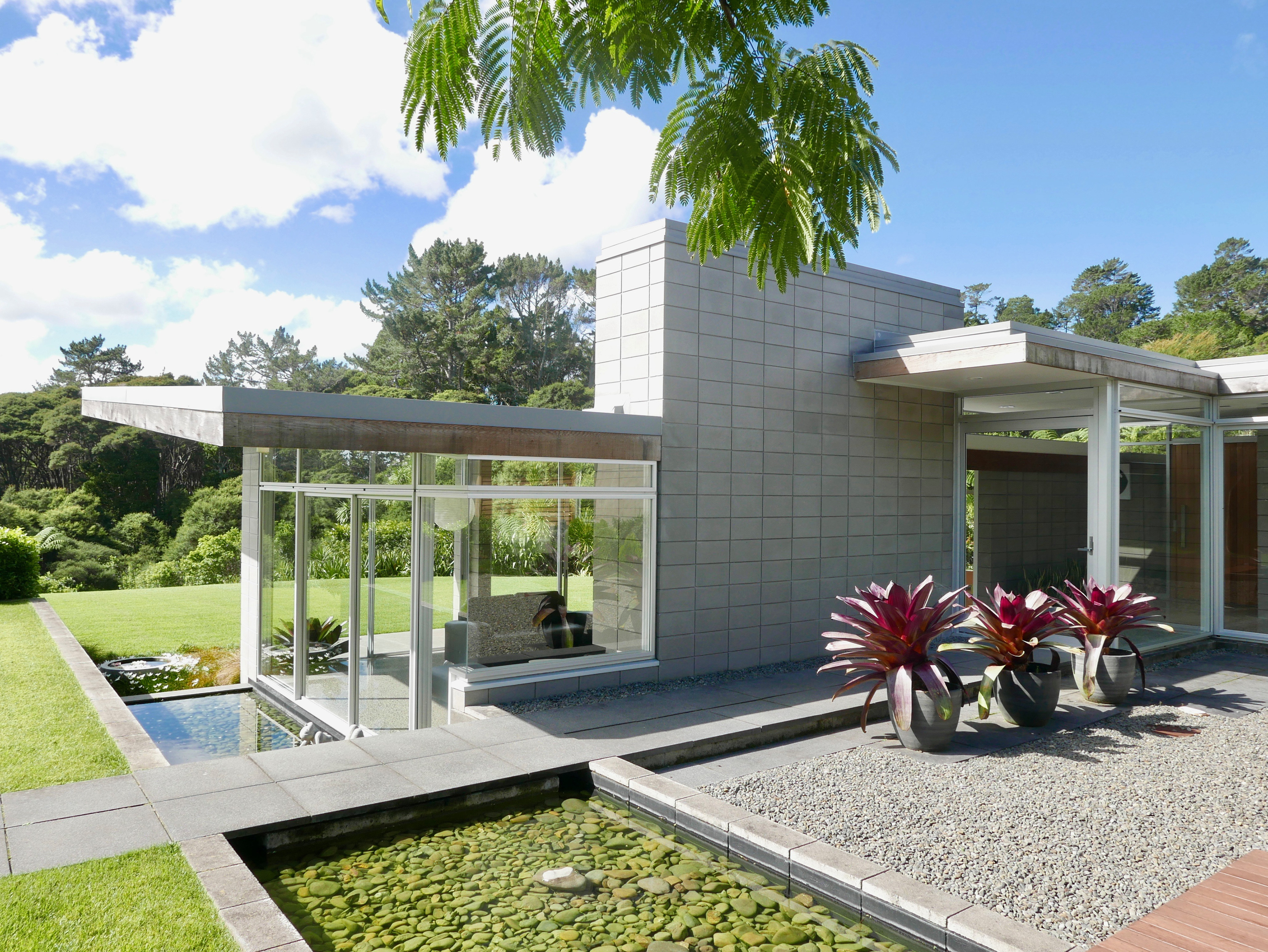 new house, auckland, new zealand trends top 30 houses 2012 Sitting on a large site at the foot of the Waitakere Ranges, this home is planned around two courtyards, one the vehicle entry court and the other a central living court. With low slug roof lines and a simple palate of exposed concrete block, cedar and glass, the house is something of a homage to the mid-century desert houses of Palm Springs.